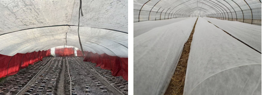 图2 保温措施(左为棚口、裙膜覆盖毛毡+加内棚,右为搭建小拱棚)